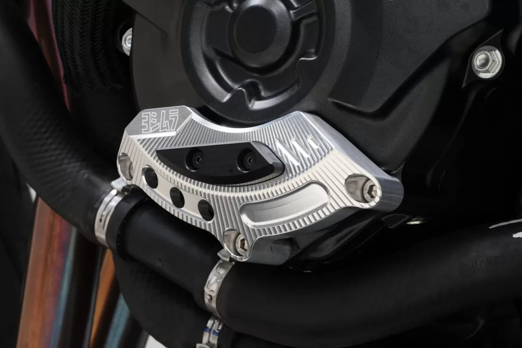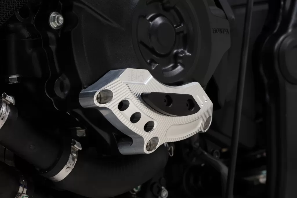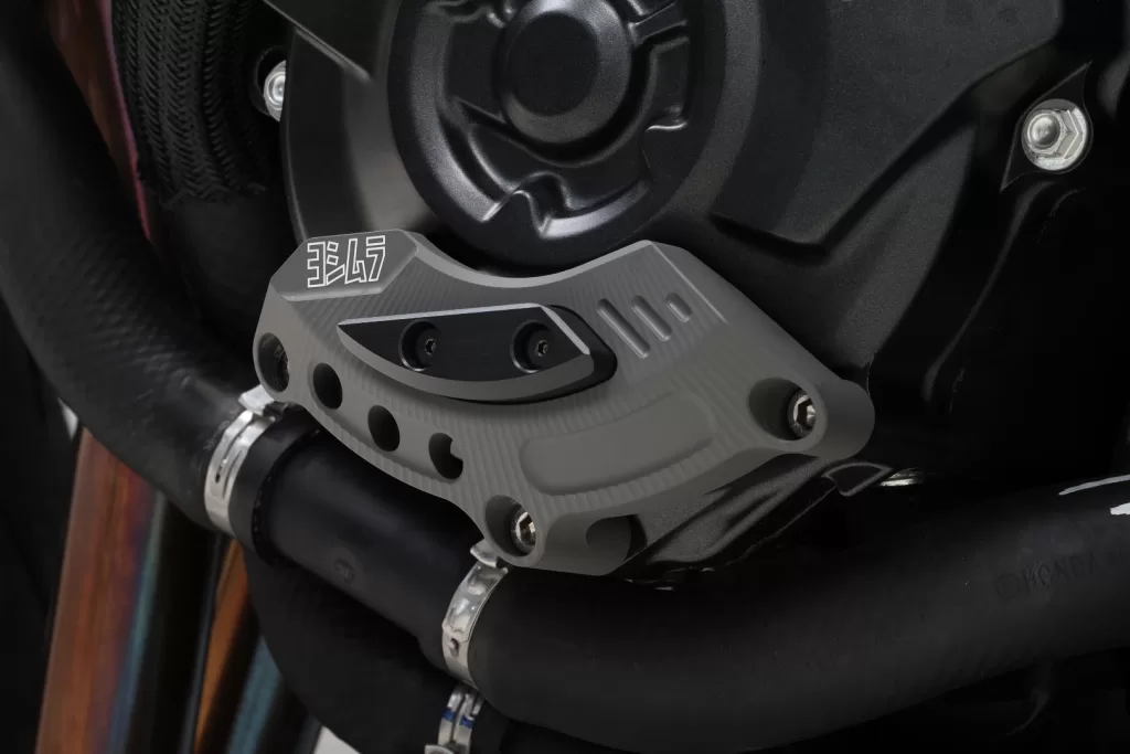 YOSHIMURA 「エンジンケースガード PRO SHIELD」は、万が一の転倒時にジェネレーターカバーへのダメージを抑え、オイル漏れなど走行不能につながるリスクを低減するためのパーツです。