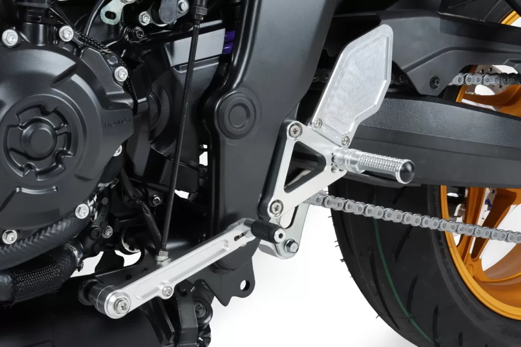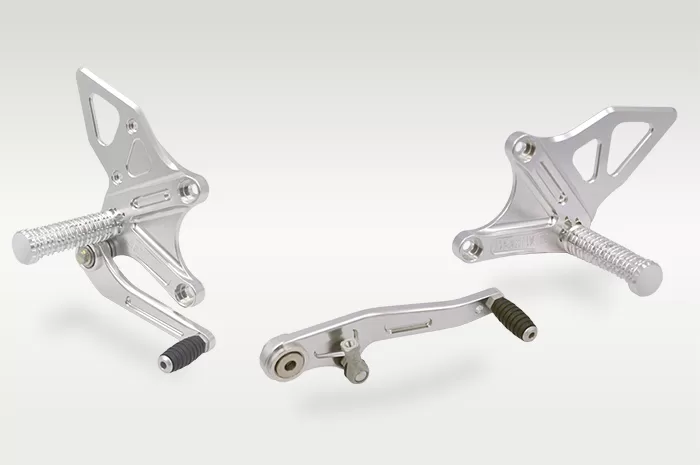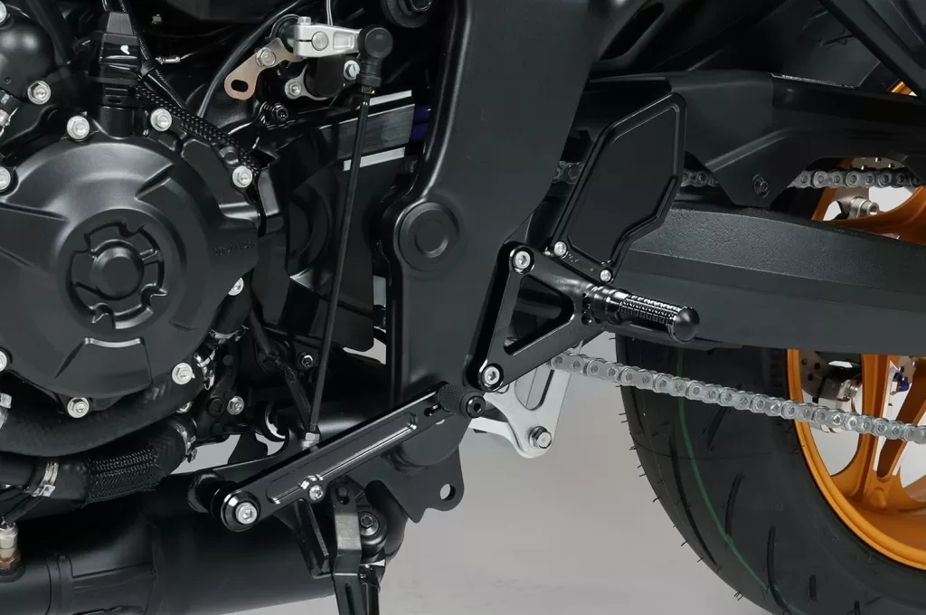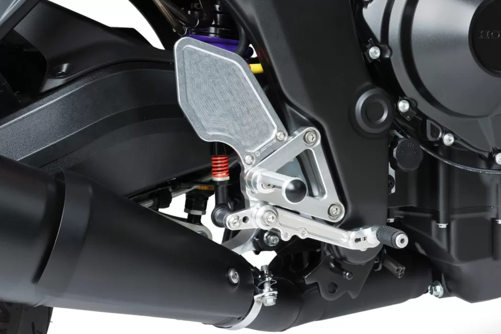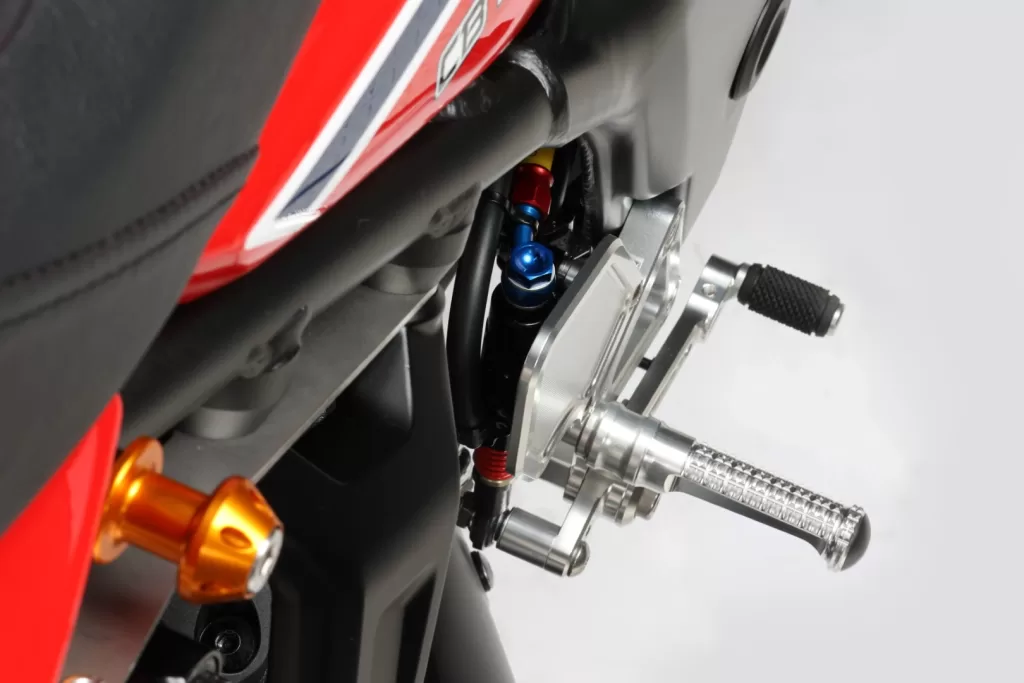 モリワキ製の「バックステップキット」は、独自の3D切削によって生み出された一体感のある造形が特徴です。パーツを一体化することで、操作時の「しなり」を抑え、ライダーの入力を無駄なく車体に伝えてくれます。