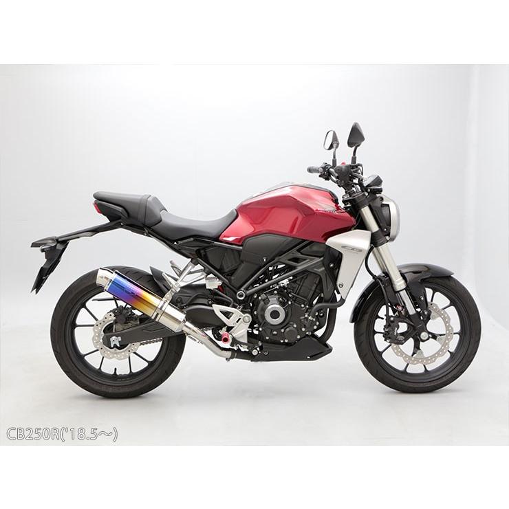 焼き色が入ったチタン素材を使ったラウンドタイプにカールエンドを採用したスリップオンマフラー。取り付け画像を見てもシェルサイズのバランスが良くCB250Rとの相性も良い製品です
