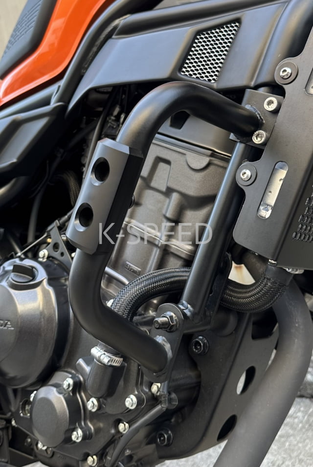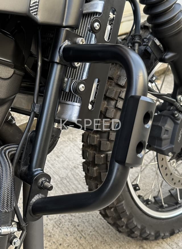 機能面では、万が一の転倒時に車体と地面の隙間を確保し、足の挟み込みを軽減。 先ほど紹介した「ラジエーターガード」と同時装着すれば、フロントからサイドにかけての統一感は完璧です。
