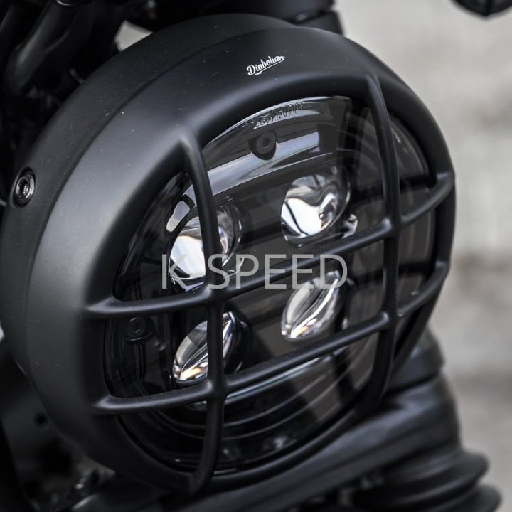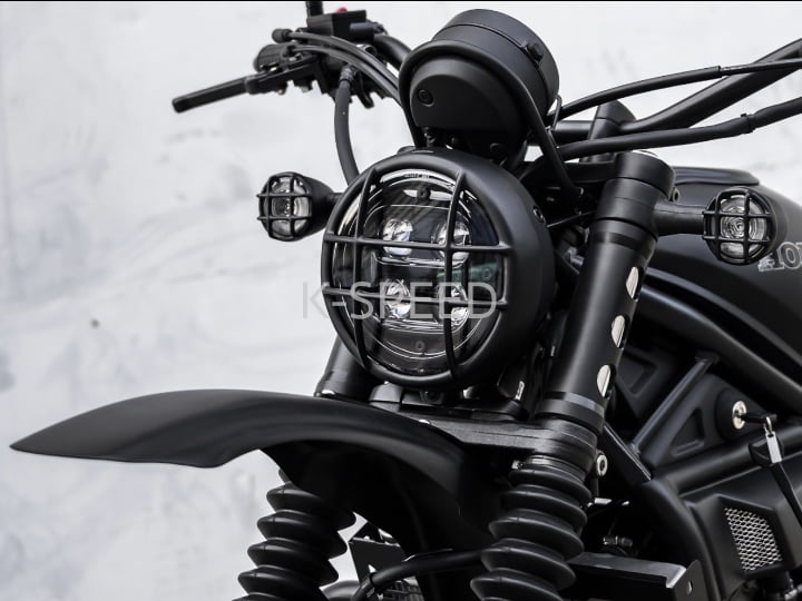 バイザー付きのヘッドライトガードも販売されています。こちらはメーター周りまで覆うデザインで、フロントマスクの印象を一変。より無骨な「トラッカースタイル」を目指す方には、外せない選択肢です。