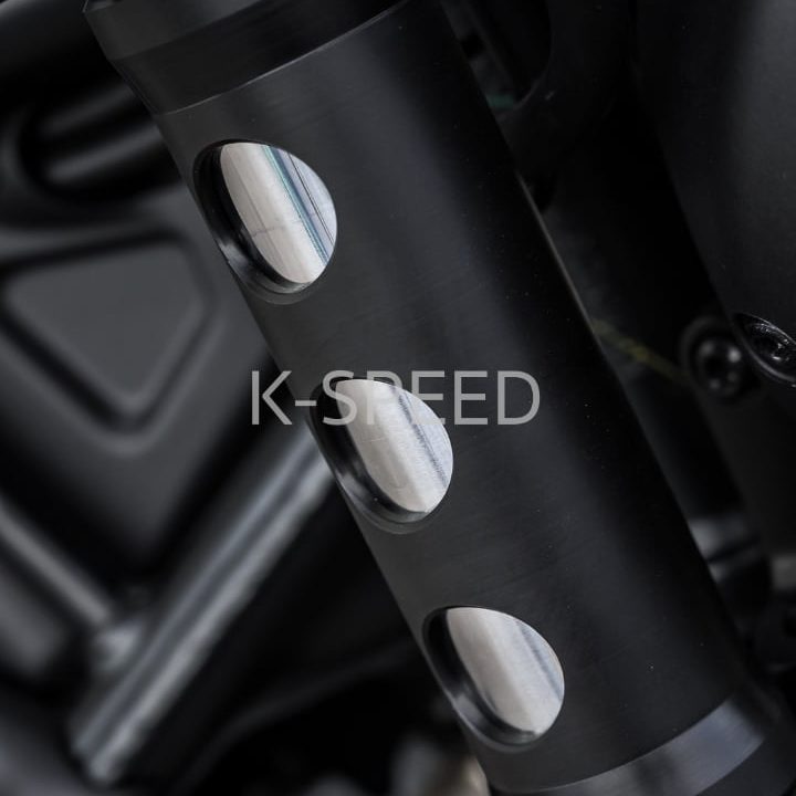 トップブリッジとステムの間のインナーチューブに装着し、フロント周りの密度を高めるカスタムパーツ。 シルバーのフォークにブラックの質感が加わることで、独特のコントラストが生まれ、足回りの雰囲気が一変します。