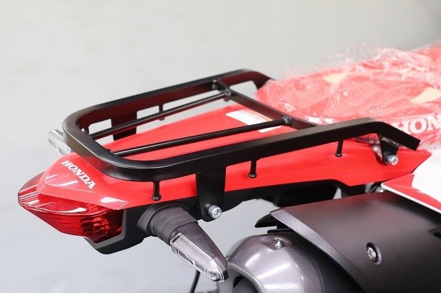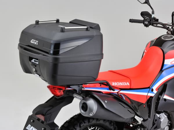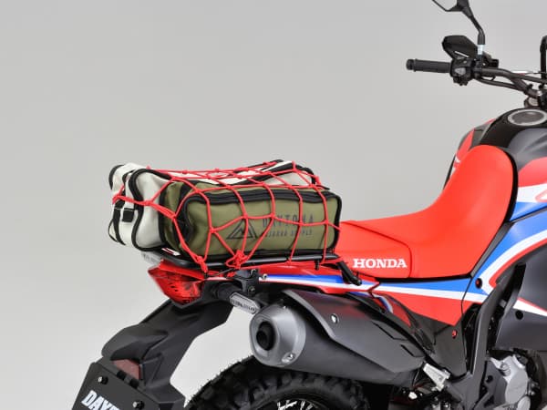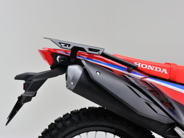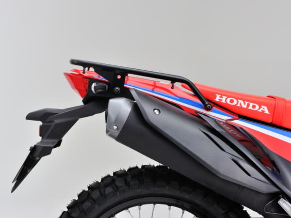トップケースや荷物を固定していない状態でも違和感なく車体に溶け込む形状で、CRFのスポーティな雰囲気を損ないません。