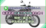 クラシカルな外観で街乗りを楽しめるエストレヤは、絶版となった今も人気が高く中古相場も値上がりしています