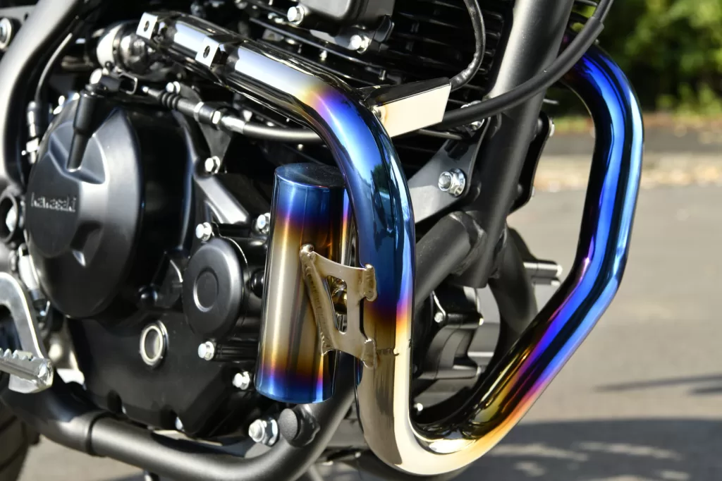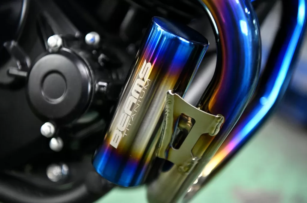 素材にはチタンを取り入れ、重量は2.7kgと非常に軽量で、純正マフラーから約50%の軽量化を実現しています。