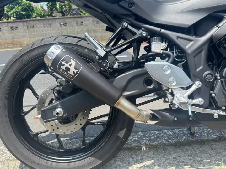 現状販売されているYZF-R3/MT-03(RH25J)ようの社外マフラーは全て車検対応品です。なので、予算、デザイン、排気音から好きなタイプを選択できます